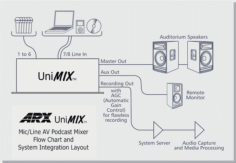 Heutzutage wird von immer mehr Bildungseinrichtungen wie Colleges, Universitäten und Gymnasien erwartet, dass sie herunterladbare Aufnahmen – Podcasts – von Vorlesungen und Kursen bereitstellen, auf die die Studenten jederzeit über das lokale Netzwerk zugreifen können. Diese Aufnahmen werden normalerweise von der Tonanlage des Klassenzimmers/Hörsaals aufgenommen und in Echtzeit auf einem Computer gespeichert. Problem 1: Es ist schwierig, den richtigen Aufnahmepegel zu erhalten, da die Pegelanforderungen sich von denen der Lautsprecher unterscheiden. Problem 2: Um einen konstanten Eingangspegel für den Computer aufrechtzuerhalten, ist eine kontinuierliche Überwachung erforderlich, um eine digitale Überlastung zu vermeiden. Die Lösung Wir stellen den neuen UniMIX von ARX vor: Sechs symmetrische XLR-Mikrofon-/Line-Eingangskanäle mit individuellen Pegelreglern sowie ein dedizierter Stereo-Cinch-Line-Eingangskanal. Jeder Mikrofon-/Line-Eingang verfügt über einen Pegel von unendlich bis +6 dB auf der Vorderseite sowie einen Eingangsverstärkungsregler von 10 bis 50 dB. Der Stereo-Line-Eingangskanal verfügt über einen Pegeltrimmregler von –10 bis +10 dB, um eine genaue Anpassung aller Line-Pegelsignale zu ermöglichen. Auf der Rückseite kann jeder der 6 elektronisch symmetrierten Mikrofon-Eingänge über einzelne Schalter auf Line umgeschaltet werden. Mehrere Master Für das Raumsystem hat der UniMIX zwei symmetrische XLR-Ausgänge mit 3-Wege-EQ und eigener Master-Pegelsteuerung. Der Aufnahmeausgang ist ein einzelner symmetrischer XLR-Ausgang, der durch einen Transformator isoliert ist, um Erdschleifen und damit verbundenes Rauschen zu verhindern. Automatische Verstärkungsregelung Der Aufnahmemaster hat auch seine eigene automatische Verstärkungsregelungsschaltung. Speziell angepasste Parameter stellen sicher, dass die Pegel unabhängig von der Mikrofonplatzierung und der Benutzertechnik konstant bleiben. Das Ergebnis ist ein konstanter Pegel für die Aufnahme, der für eine bessere Verständlichkeit sorgt und die Notwendigkeit einer ständigen Überwachung sowie das Risiko von Überlastung und Verzerrung überflüssig macht. Die letzte Master-Steuerung speist das Hauptsignal in einen transformatorisolierten symmetrischen XLR-Hilfsausgang ein. Dieser kann für zukünftige Erweiterungen, Fernüberwachung oder zur Speisung eines drahtlosen Senders oder eines anderen Geräts verwendet werden. Globale Phantomspeisung ist an allen Mikrofoneingängen mit einem Schalter auf der Rückseite mit zugehöriger Status-LED auf der Vorderseite verfügbar. Großer Dynamikbereich Intern wurde sorgfältig auf das Design des Signalpfads geachtet und Präzisionskomponenten verwendet, die in High-End-Mischpulten zu finden sind. Dies hat zu einem Gerät mit sehr großem Dynamikbereich geführt. Der UniMIX hat genügend Spielraum, um mit den heißesten Leitungssignalen fertig zu werden, und übertrifft die Spezifikationen für digitales Rauschen. Universelle Wechselstromversorgung Der Wechselstrombereich beträgt universell 100 bis 120 V oder 220 bis 240 V Wechselstrom und wird über einen standardmäßigen dreipoligen IEC-Stecker mit eingebauter Sicherung und Spannungswechselschalter an das Gerät angeschlossen. Spezifikationen: Eingangsimpedanz Mikrofon: 4 K Ohm symmetrisch, Line 22 K Ohm unsymmetrisch Eingangsverstärkung Mikrofon: variabel 10 dB bis 50 dB mit hinterem Trimmregler, Mikrofon-/Line-Schalter -20 dB Ausgangspegel (max.) +21 dB AGC-Schwellenwert –50 bis –20 dB AGC-Ausgangsverstärkung –20 bis +20 dB Phantomspeisung: +48 VDC umschaltbar an allen Mikrofoneingängen Ausgangssignal/-rauschen (bei Einheitsverstärkung) -90 dB A-gewichtet, alle Eingänge bei Einheit, Master bei Einheit Dynamikbereich 115 dB Master-Ausgangs-EQ Niedrig 100 Hz 15 dBCut/Boost Mittel 800 Hz 15 dBCut/Boost Bell, Broad Q Hoch 10 KHz 15 dBCut/Boost Master-Ausgänge elektronisch symmetriert XLR 300 Ohm Line-Pegel symmetrische Ausgangsanschlüsse Stecker XLR: Pin 1 Masse, Pin 2 +, Pin 3 – Frequenzgang 20 Hz – 20 kHz ± 1 dB Verzerrung (bei Einheitsverstärkung unter 0,0035 %, 100 Hz bis 10 kHz Eingangsanschlusstyp Mikrofon/Leitung – Amphenol XLR weiblich, Hi Z-Eingang – Phono (RCA-Typ) Ausgangsanschlusstyp Amphenol XLR männlich Aufnahmeausgangsanschlusstyp Amphenol XLR männlich Bedienelemente auf der Vorderseite Individuelle Pegelregler für jeden Eingangskanal – unendlich über 0 dB bis +6 dB Individuelle Verstärkungsregler für jeden Eingangskanal, 10 bis 50 dB Stereo-Line-In-Pegel- und Trimmregler Master-Ausgang 3-Wege-EQ und Pegelregler Systemstatus-LEDs Recording-Master-Pegelregler und automatische Verstärkungsregelungs-Schwellenwerttrimmung Zusätzlicher Master-Ausgangsregler Markierungsfeld zum Beschriften der Eingangskanäle Rückseite 6 x symmetrische XLR-Buchseneingänge, verkabelt Pin 1 Audio-Masse, Pin 2 +, Pin 3 – Stereo-Line-Eingänge vom Typ Cinch Transformatorisolierter symmetrischer XLR-Aufnahmeausgang Linke und rechte symmetrische XLR-Steckerausgänge, verkabelt Pin 1 Audio-Masse, Pin 2 +, Pin 3 – Transformatorisolierter zusätzlicher Master-XLR-Ausgang Globaler Mikrofoneingang Phantomspeisungsschalter Abnehmbarer AC-Eingangsstecker vom Typ IEC mit eingebauter Sicherung Hersteller: